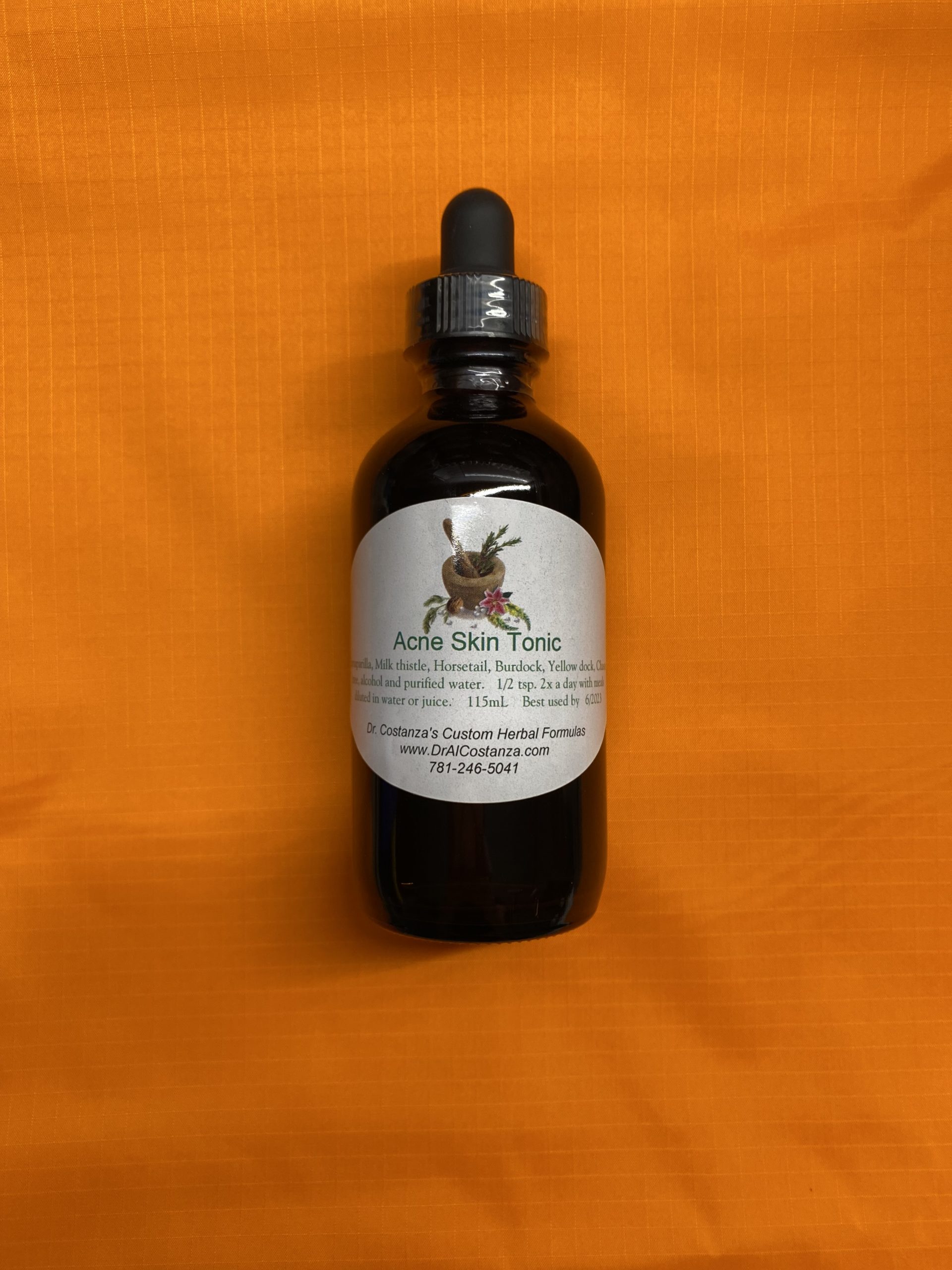 4 oz glass dropper bottle of special herbal extract blend (Sarsaparilla, Milk Thistle, Horsetail, Burdock, Yellow Dock, Chaste Tree, alcohol and purified water) intended to be diluted in water or juice, with a recommended dosage of 1/2 tsp 2x a day. This formula is a liver, kidney, and blood cleanser, intended to help improve acne symptom and encourage healthy skin*
