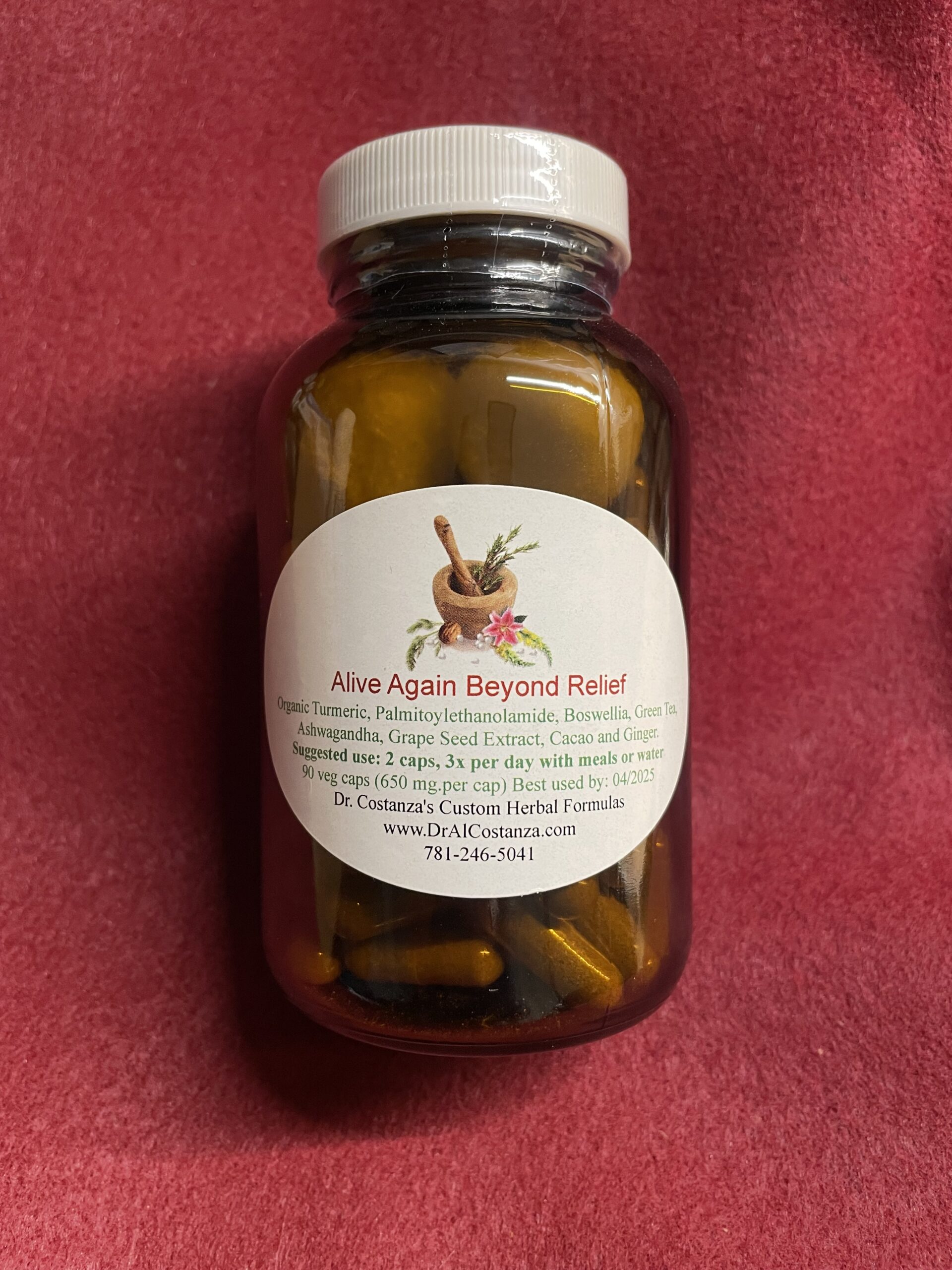 Encapsulated formula of all-natural and organic ingredients (Turmeric, Palmitoylethanolamide, Boswelia, Green Tea, Ashwagandha, Grape Seed Extract, Cacao, and Ginger). 90 veg.caps per bottle (650 mg powder per cap) with a suggested use of 2 caps, 2-3 times per day with meals*. This anti-inflammatory formula is designed to promote a healthy inflammatory response, while helping reduce symptoms of chronic fatigue, brain fog, digestive problems, and joint/muscle aches*