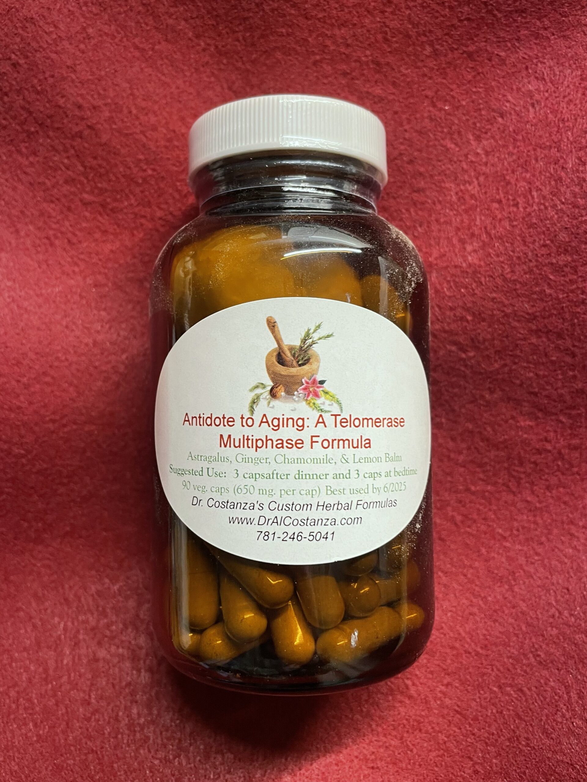 Sealed plastic container filled with 90 capsules (each filled with 650 mg per cap) all-natural powder blend (Astragalus, Ginger, Chamomile, and Lemon Balm) with a recommended dosage of 2 capsules, 2-3 times per day. This product was designed to help rebuild the end caps of our chromosomes, called telomeres. Theoretically by elongating the telomeres, we are helping to reverse the aging process.*