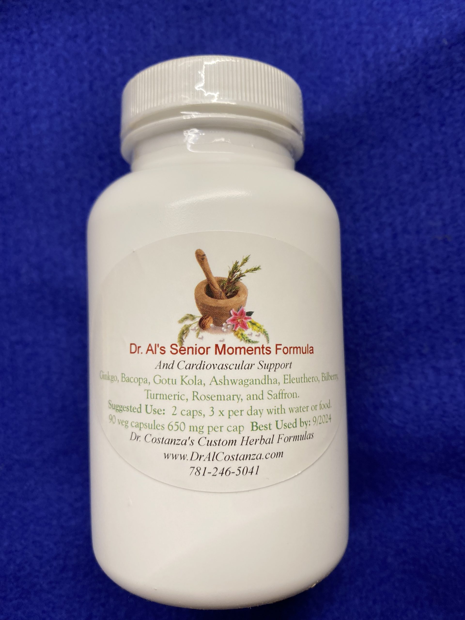 Encapsulated powder blend of all-natural and organic ingredients (Gingko, Bacopa, Gotu Kola, Ashwagandha, Eleuthero, Bilberry, Turmeric, Rosemary, and Saffron); 90 veg.caps per bottle (650 mg powder per cap) with a suggested use of 2 caps, 2-3 times per day with meals or water* . Designed to help improve memory, focus, alertness, clarity, brain energy, improvement of circulation, and for prevention of degenerative disease of the brain*