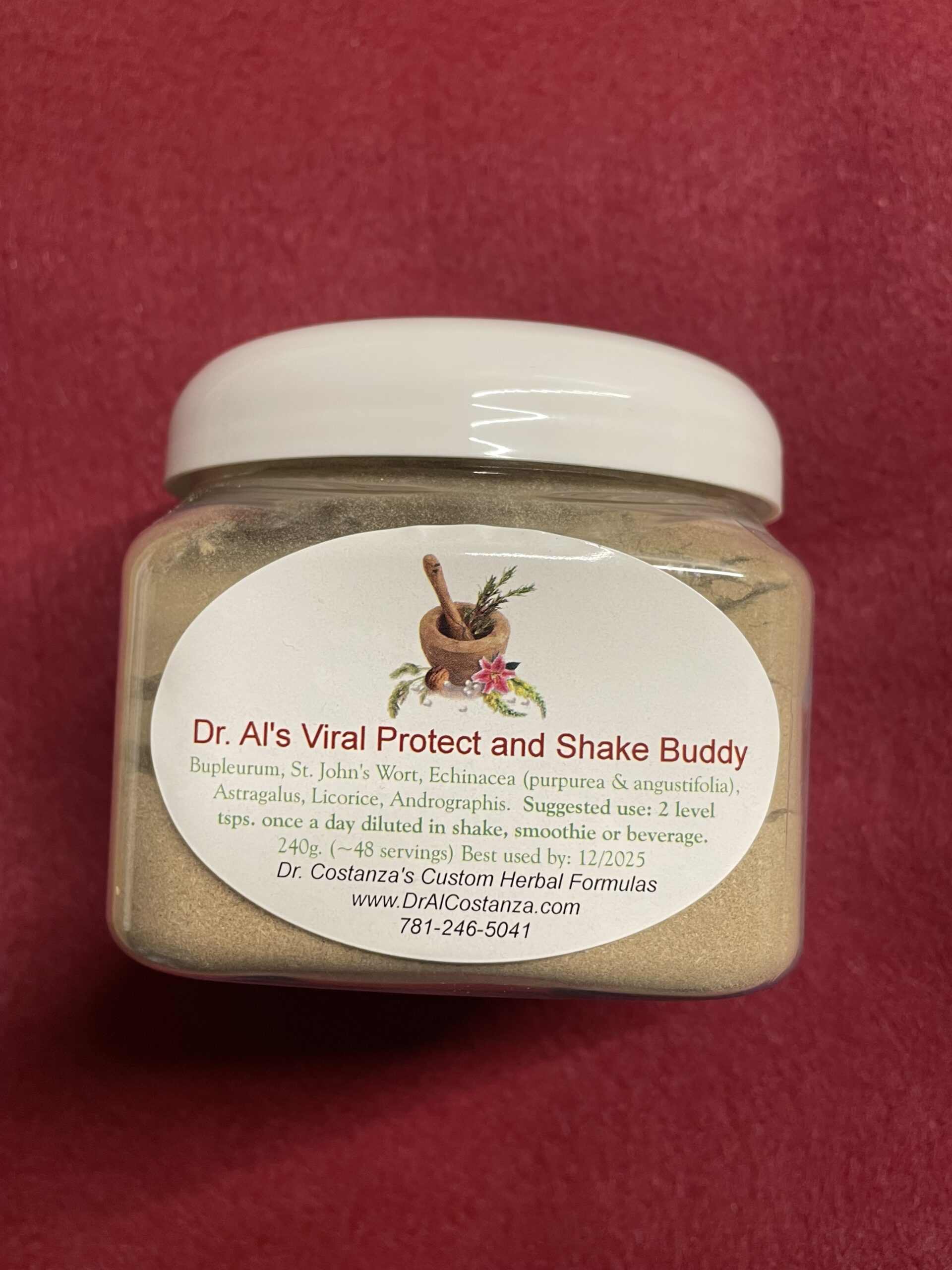 240 grams of powder formula (~95 servings per container) of all-organic herbal ingredients (Bupleurum, St. John’s Wort, Echinacea, Astragalus, Licorice, Thuja, and Andrographis) with a suggested use of 1 level tsp per day, mixed in water or another beverage*. This is your go-to anti-viral and anti-bacterial formula designed to help boost your immunity and help prevent and/or recover from viral/bacterial infections.